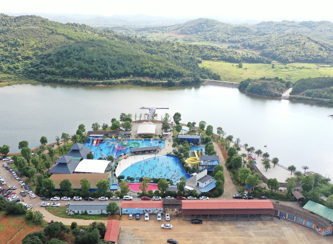 从高空俯瞰樟市镇望湖生态庄园,四周青山环绕、河水碧波荡漾,依山傍水而建的水上乐园风景秀丽,音乐冲浪池内早已挤满游客,大家在动感的音乐中伴随着浪花前后摇摆。儿童嬉水池里,各种卡通造型的游乐为孩子们打造了一个水上童话王国。高空玻璃漂流和水上滑梯造型各异,游客们从滑梯顺流而下,激起层层水花,感受水上速度、激情和清爽。