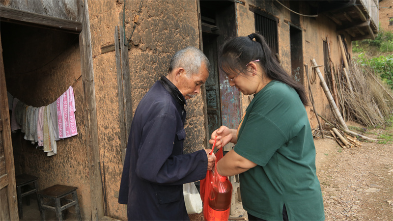 桂阳县欧阳海镇增家源村村民代表龚秋霞为留守老人运送物资