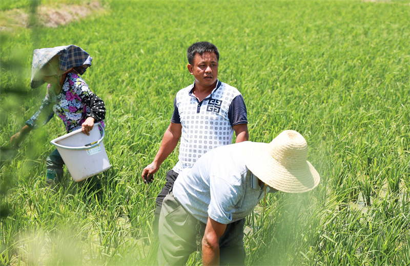 荷叶镇新市村村民代表、种田大户谭家桂正指导10余名村民施肥、除草