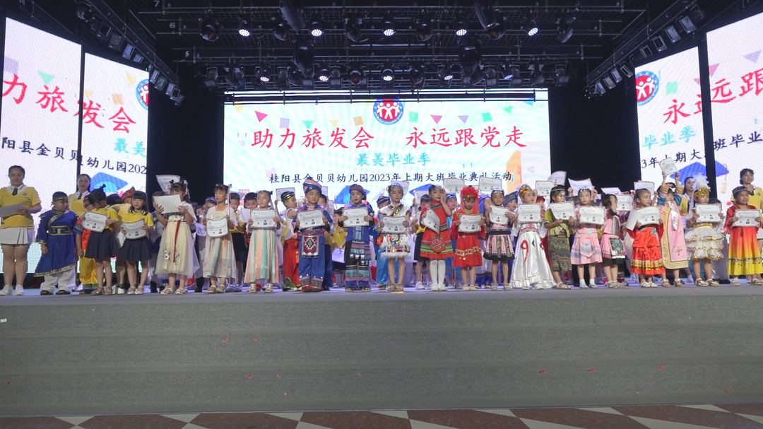 新桂阳7月13日讯(记者 陈英)7月12日,金贝贝幼儿园在县融媒体中心举办“助力旅发会 永远跟党走”大班毕业典礼活动。