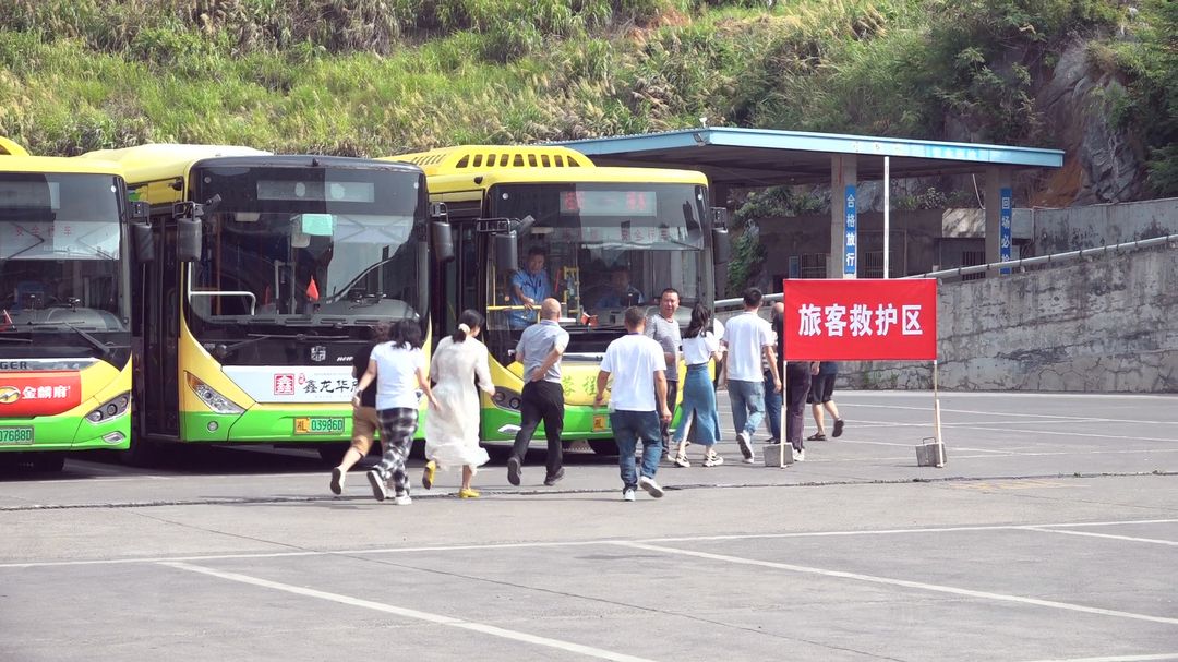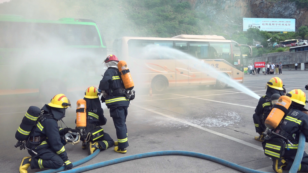 演练模拟一辆班线客运车辆于骏马大道金山路段追尾一辆旅游客运车辆,造成两车受损,一人受伤,数分钟后,旅游客车电源线路短路,产生冒烟、起火。随即,客车司机首先有序组织乘客疏散逃离危险区域,并放置三角木警示牌,对初期起火采用灭火器对关键部位灭火,然后向119、122、120等相关部门报警,救援车辆入场处置。随后,交警、保险对现场警戒和查勘,120急救车转运受伤人员,客车驾驶员清点人数后对剩余乘客安全转运,最后对现场车辆进行抢修。