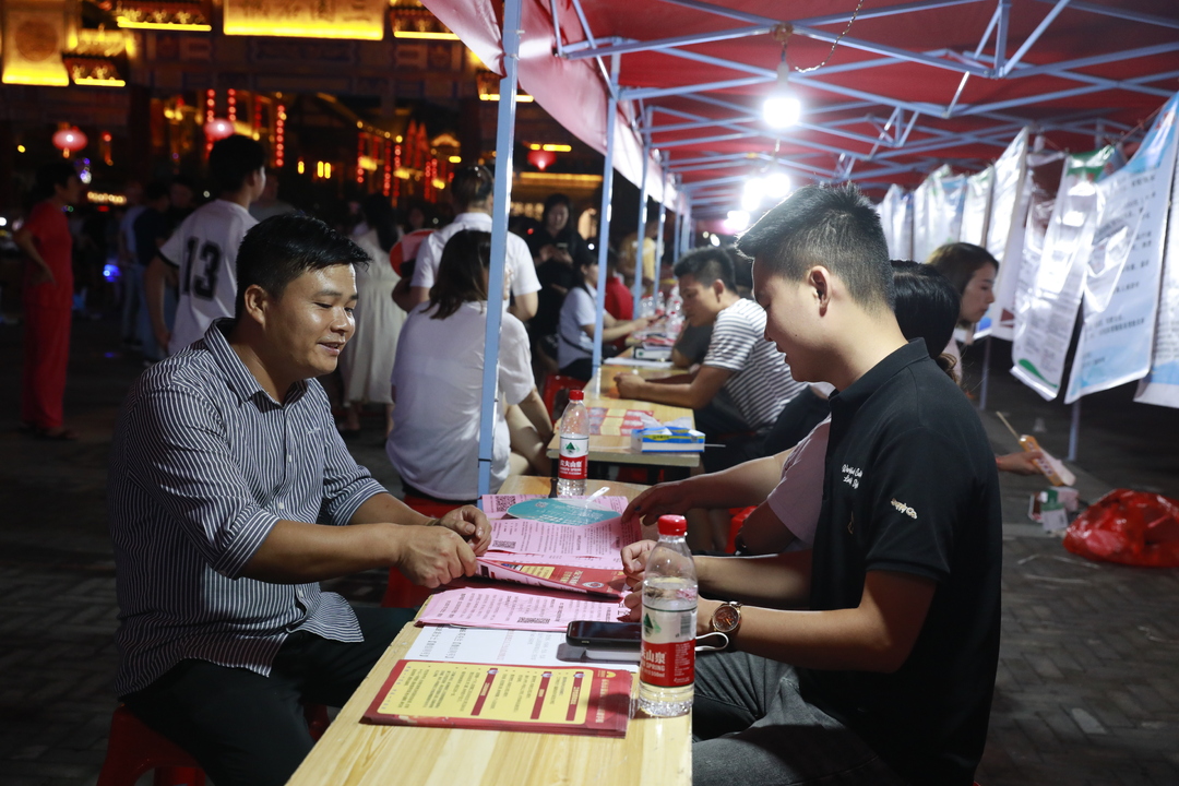 新桂阳7月28日讯(记者 曹诗灏 欧阳宇轩 实习生 谭欣)“职引未来,筑梦青春”。7月27日至28日晚间,我县在文化园古郡城内举行2023年“百日千万招聘专项行动”,依托古郡夜市“烟火气”,为就业服务“聚人气”,为求职者搭建一个别样的岗位供需平台,助力家门口求职就业,解决企业用工需求。