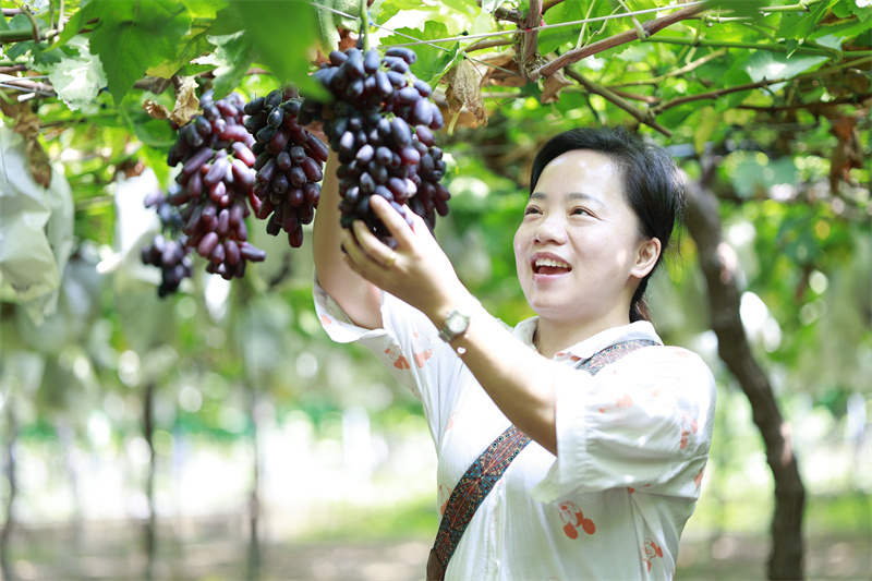 游客梁凤兰是广州人,听朋友说梧桐香印果园适合采摘,葡萄品质较好,慕名而来,采摘后迫不及待吃了起来。“这里的葡萄口感香甜,味道比较浓郁,带着亲友来采摘味道更不一样。”梁凤兰笑着说道。