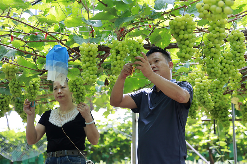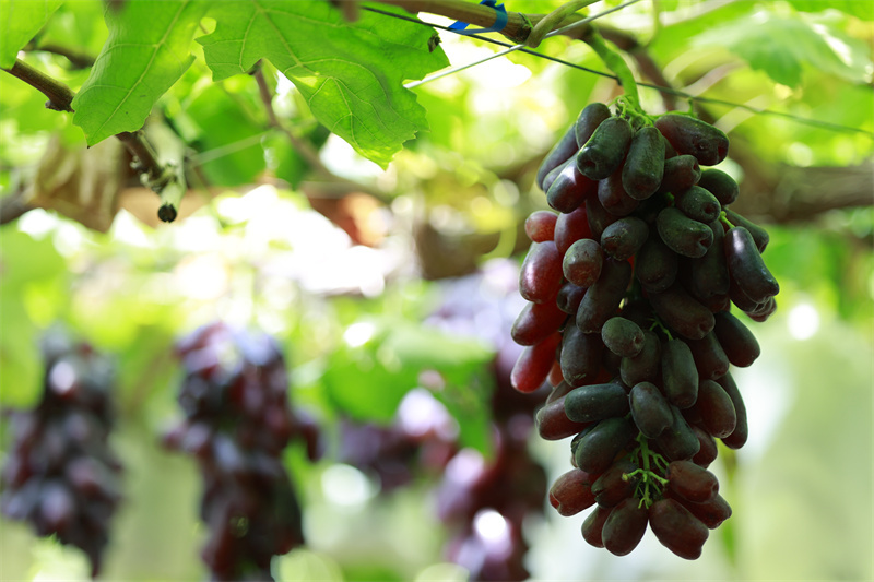 新桂阳8月28日讯(记者 陈勇 欧阳宇轩)当前正值阳光玫瑰、月光之泪、夏黑等葡萄成熟、新鲜上市的季节,桂阳县广大农户忙着采摘,供应各地市场。不少游客慕名前往葡萄园,享受采摘乐趣。