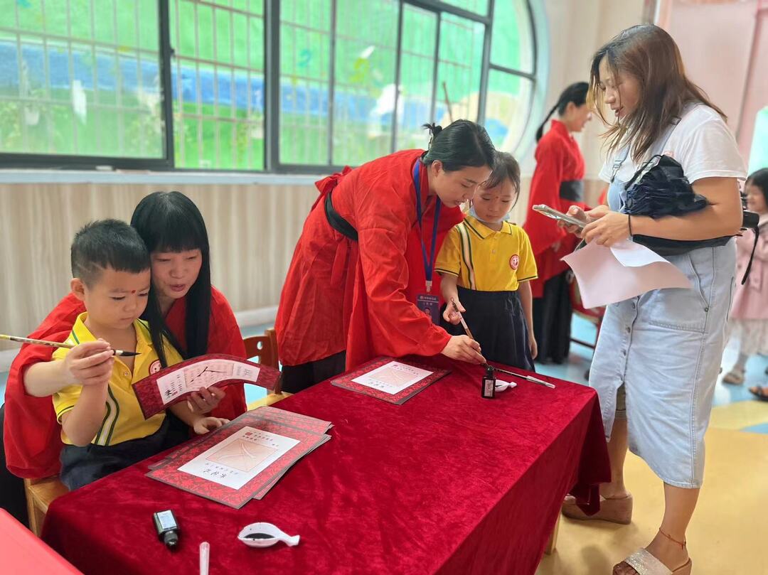 “朱砂启智勤为径,学海无涯求新知”。一大早,幼儿们挥别父母,踏着歌声,满怀憧憬与喜悦在老师带领下迈步“启智门”,老师们亲自执笔蹲下身在幼儿们额头正中间点朱砂,是为朱砂启智,并让每一位新生击鼓明志,一击鼓,尊敬师长;二击鼓,成人成才;三击鼓,报孝父母。随后,在老师们的引导下,孩子们用毛笔一撇一捺写下“人”字,开笔启蒙,教育孩子们行得正,坐得端,堂堂正正做人。