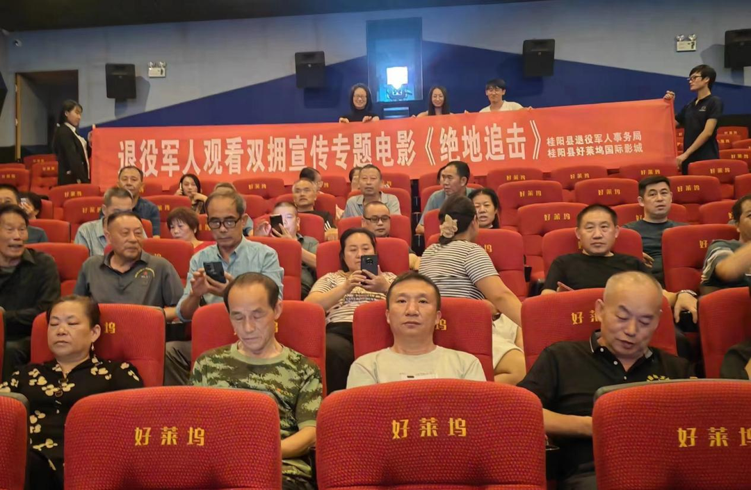 9月24日晚,桂阳县双拥办、县退役军人事务局联合桂阳好莱坞国际影城组织30余名退役老兵观看双拥主题电影《绝地追击》。一个多小时的电影,现场退役老兵一起沉浸在紧张的观影氛围中,看到电影中边防武警为执行任务英勇牺牲时,现场退役老兵一个个眼含热泪,看到电影中毒贩被抓时现场不时传来阵阵欢呼。