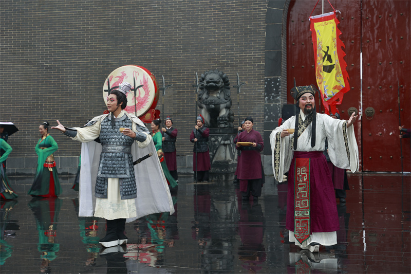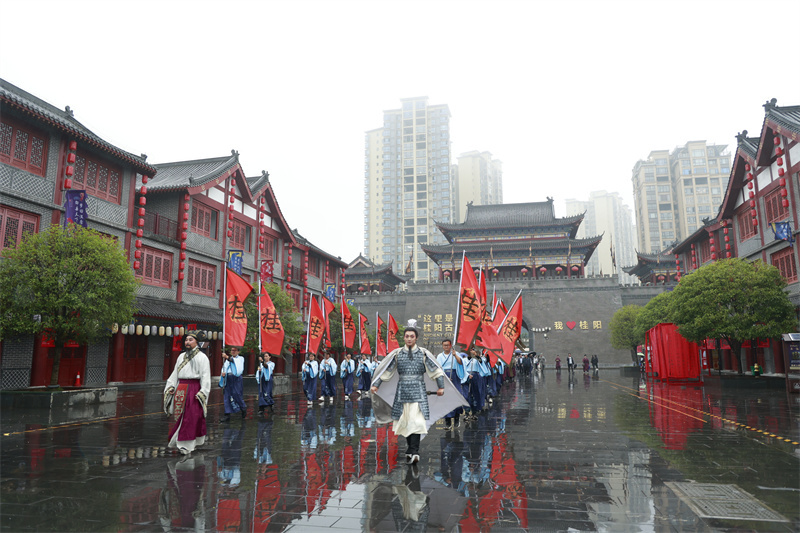 在桂阳文化园研学营开营仪式上,伴随着阵阵铜鼓声,一批旗兵、将士或手拿旌旗,或手持长戟自城门两侧列队恭迎,气宇轩昂的将军宣布“大开城门”,引导研学师生们入住营地。