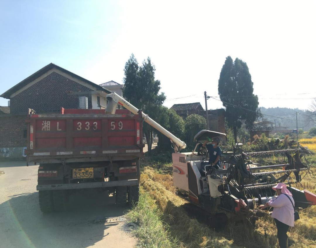 新桂阳 10月20日讯(通讯员尹友飞)春种一粒粟,秋收万颗子,10月18日,桂阳县樟市镇3万余亩晚稻进入成熟收割期,金黄的晚稻田成块连片,空气中弥散着阵阵清香,机身隆隆,脱稻谷、除秸秆、谷装车、有条不紊,田间一派繁忙的丰收景象,收获着丰收的喜悦。