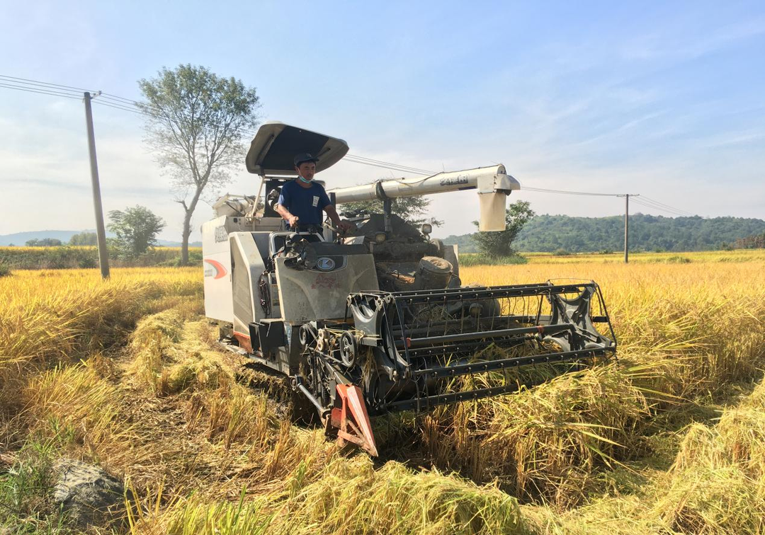 在樟市镇樟市村,阵阵轰鸣声响彻田间,收割机在稻田中来回穿梭,一串串饱满的稻穗被快速转动的齿轮卷入“腹中”,短短时间内,收割、脱粒、粉碎稻秆等工具一气呵成,看着金黄饱满的稻谷“尽收囊中”,农民的喜悦之情溢于言表。
