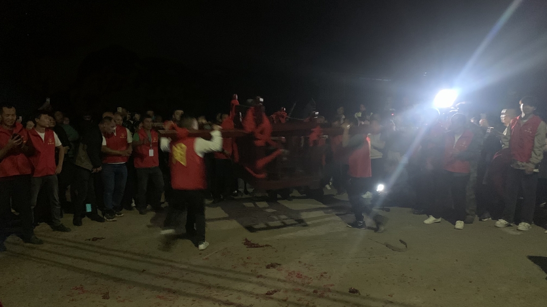 当晚饭后,村民们齐聚祠堂祭拜太祖,四名身强体壮的年轻小伙把太祖公公的塑像请进特制的“轿子”,然后抬出祠堂进入村子。每到村里的一处开阔地,抬轿的小伙子要原地一边摇太祖公塑像一边原地转圈,村民围成一圈,抬轿的人越少、太祖公的塑像摇得越厉害,大家的欢呼声就越大,这称之为“闹祖”,寓意普度众生。整个“闹太祖公”过程分为祭祖、“骂”祖、起马(入轿)、闹祖、游神、归位六个环节,既表达了对祖先的敬畏,同时祈佑风调雨顺、人丁兴旺。
