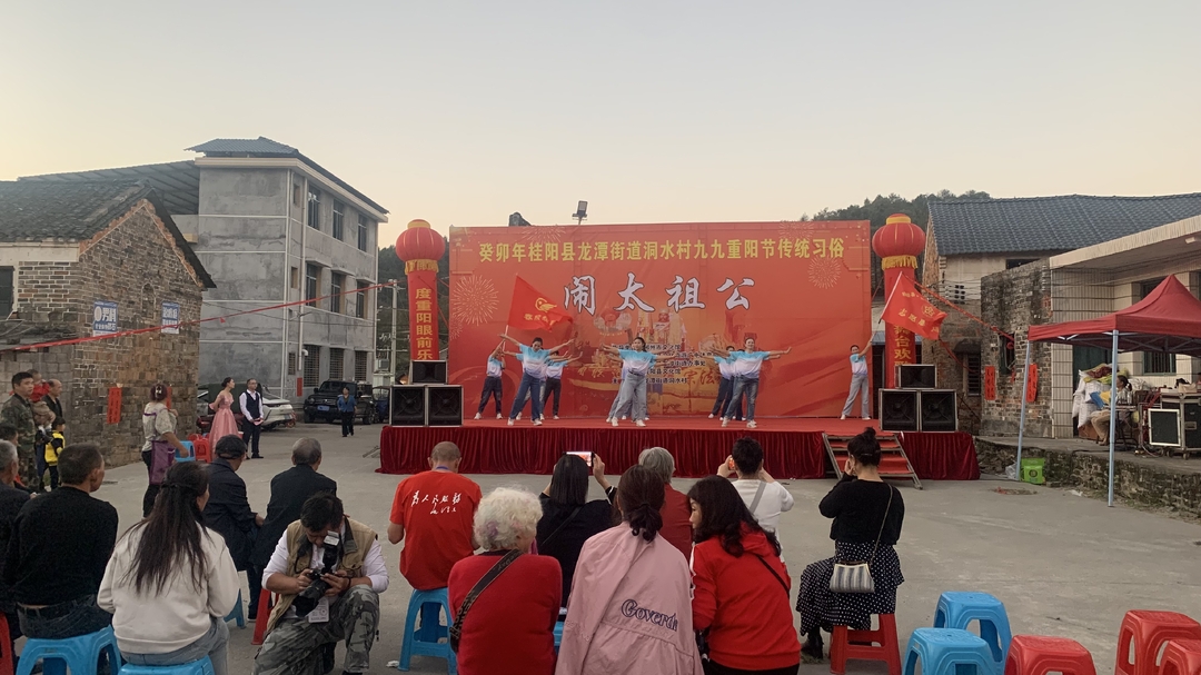 新桂阳10月24日讯(记者 曹诗灏)10月23日是农历九月九日“重阳节”,龙潭街道洞水村鞭炮齐鸣,锣鼓喧天,热闹非凡,村里举办了每年一度的民俗文化活动“闹太祖公”,文化志愿者还表演了歌伴舞、独唱、昆曲、琵琶独奏和情景剧等十余个节目,庆祝重阳佳节。