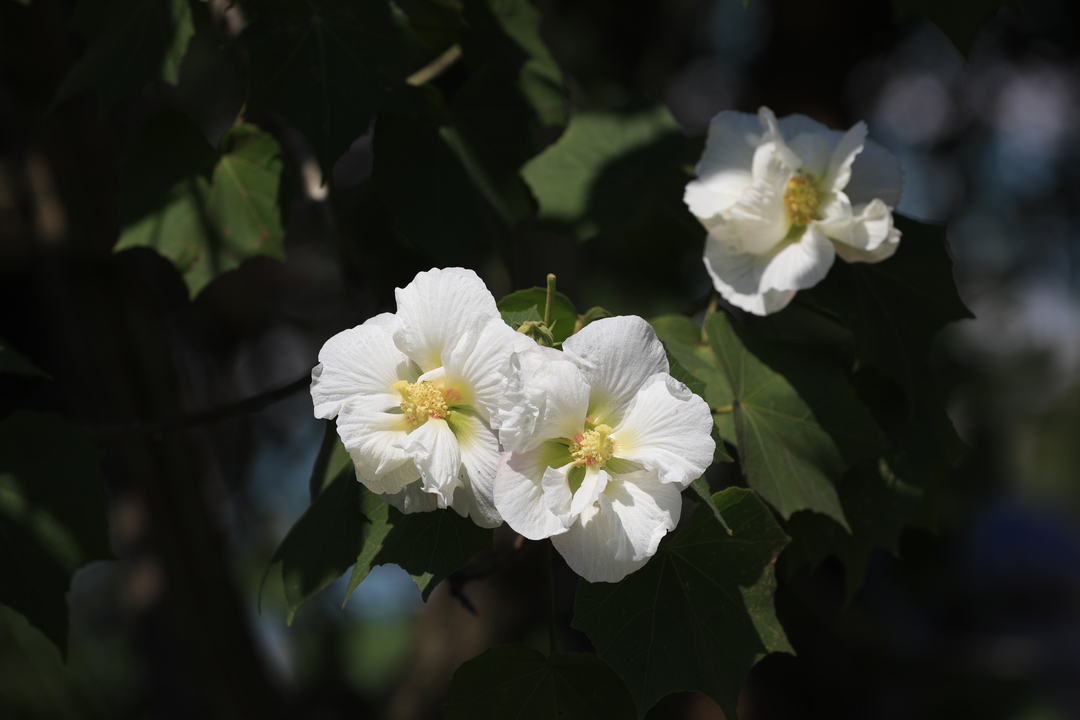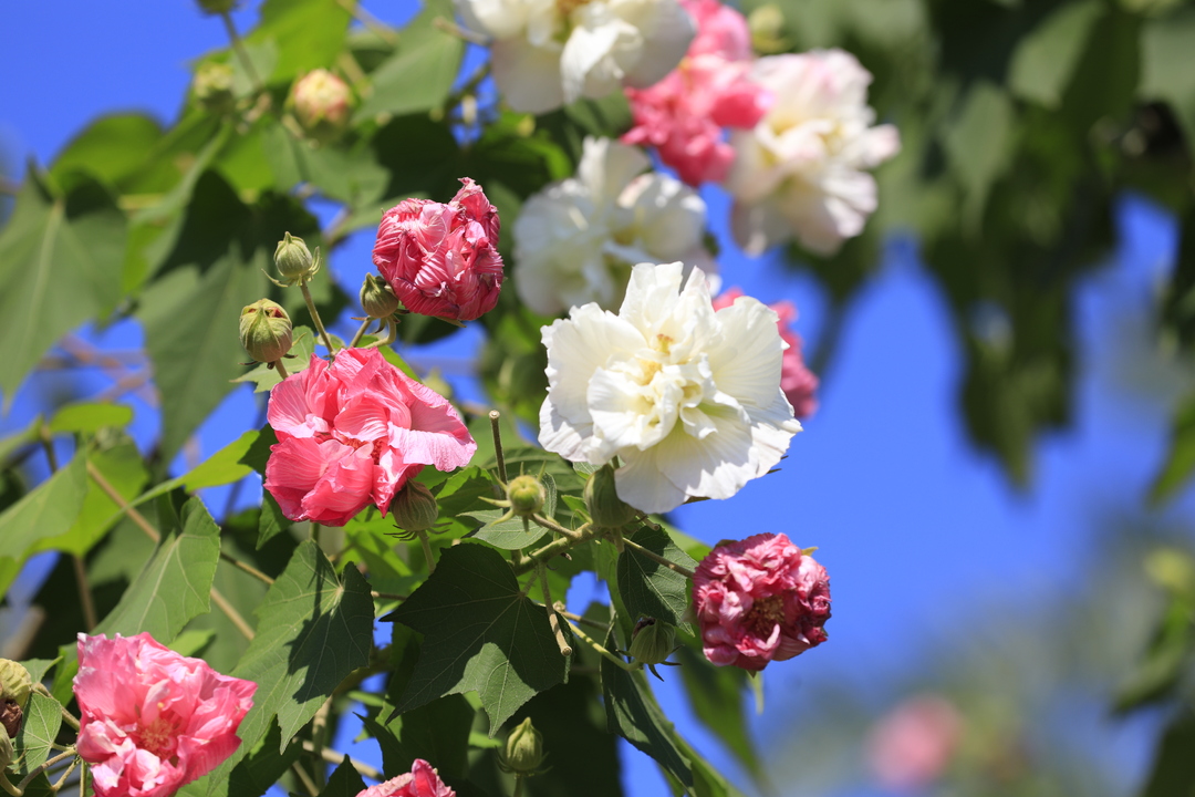 木芙蓉是陆上的“荷光秋色”,花朵或白或粉或红,皎若芙蓉出水,艳似菡萏展瓣。花朵颜色一日三变,清晨雪白,中午粉红,傍晚深红。纯白的花瓣向外舒展后,随着太阳升起,则宛如抹上一层胭脂,“变脸”为娇艳的粉色,在这金秋缤纷美景中,勾勒出一幅绚丽的秋日水彩画。