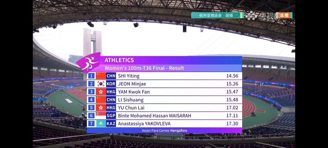 上午十点多,杭州亚残运会田径项目女子100米T36级决赛开赛。在史逸婷的母校桂阳三中,史逸婷的母校老师、启蒙教练、学弟学妹和县残联的工作人员通过直播观赛,大家热情高涨,现场爆发阵阵加油声。赛场内,史逸婷反应迅速、顺利起跑,稳稳夺冠。