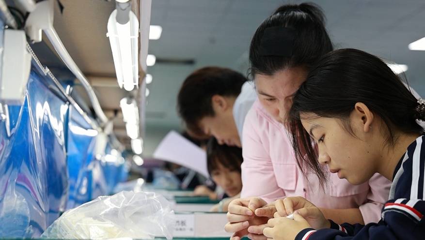 新桂阳11月1日讯(记者 陈勇 欧阳宇轩)“通过专业培训,这些学生上手非常快。”10月30日,在桂阳县职业技术教育学校产教融合基地,一批职校学生在老师的指导下正在流水线进行实操。