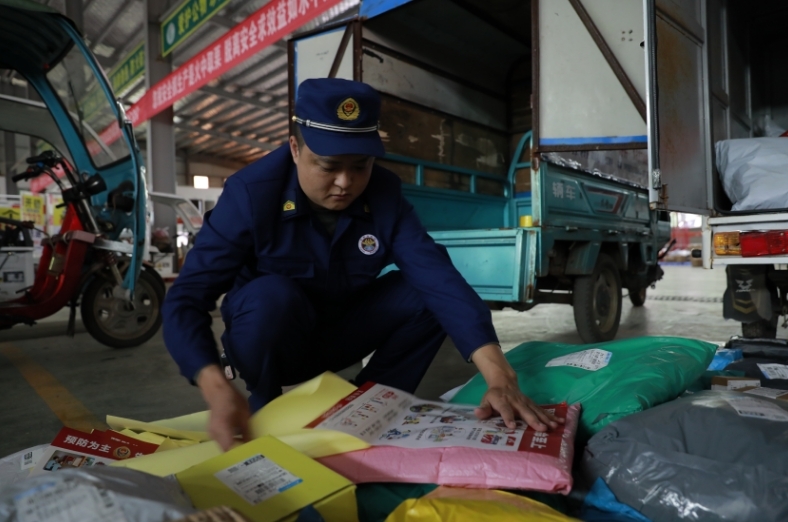 在县农村电商物流配送(仓储)中心,消防宣传人员正在为快递包裹、快递配送车辆贴上消防安全单和消防海报,让快递小哥化身消防安全卫士,把这些搭载安全消防“知识”的快递送到群众手中,让群众在享受便利物流服务的同时,进一步了解消防安全的重要性。