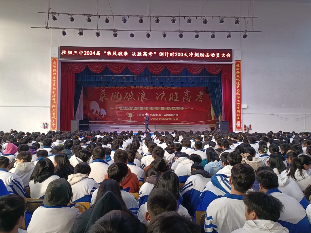 新桂阳11月20日讯(记者 李勇)11月19日,桂阳三中举行2024届高考倒计时200天冲刺励志动员会。邀请纵横教育集团讲师分别以“乘风破浪 决胜高考”、“做智慧家长·育优秀儿女”为主题,向高三学子和家长作一堂别开生面的讲座。