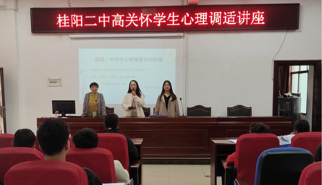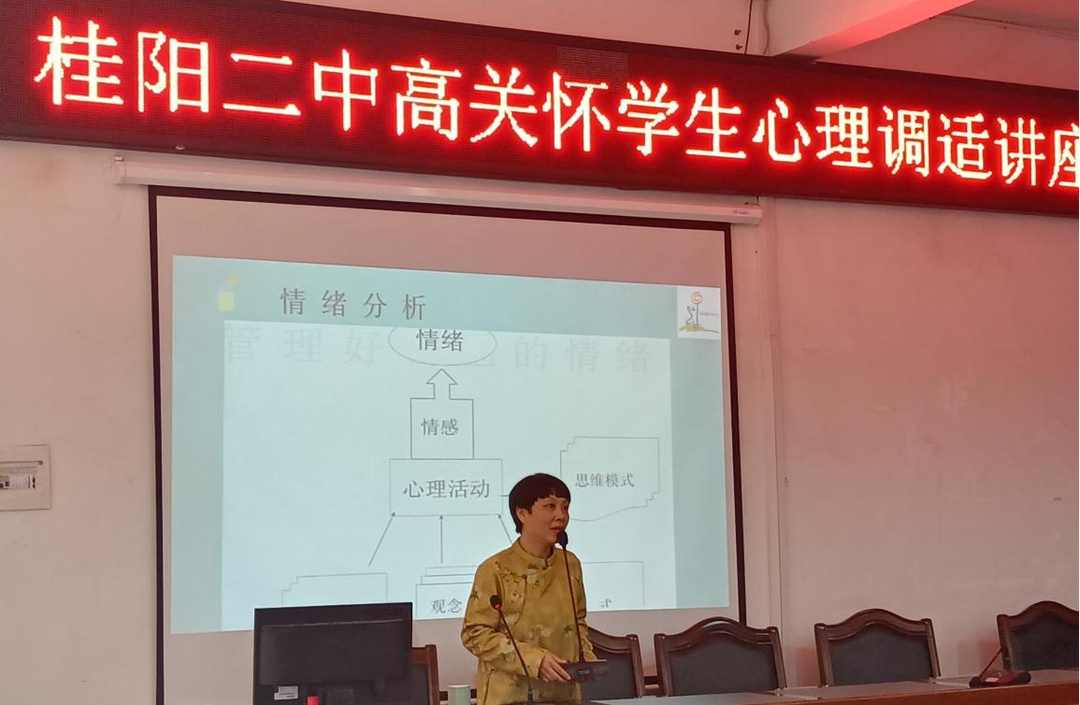 新桂阳11月29日讯(通讯员 刘平 夏旭艳)11月24日,桂阳二中特邀郴州市阳光青少年社会服务中心李丽华老师来学校开展讲座活动,为焦虑、抑郁、压力过大等情绪困扰的高关怀学生提供心理支持和帮助。