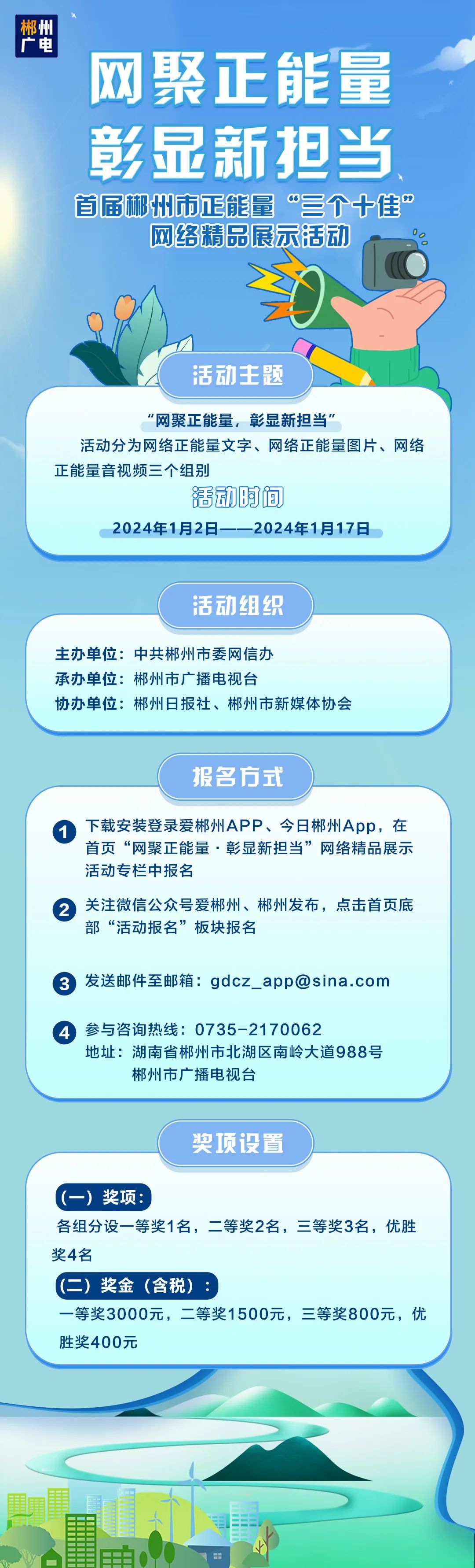 六、分组类别 首届郴州市正能量“三个十佳”网络精品展示活动共设置三个组别,每组评出10个作品: (一)网络正能量文字:遴选对象为大力弘扬主流价值,积极传播郴州正能量,产生广泛、正向社会影响的网络评论、网络消息、网络纪实、网言网语等以文字为主要载体的作品。 (二)网络正能量图片:遴选对象为突出郴州元素、感染力强、传播面广,充分体现郴州的喜人变化、赞美家乡美好、内涵深刻的摄影图片、静态创意图片、动态创意图片等以图片为主要载体的作品。 (三)网络正能量音视频:遴选对象为创意新颖、语态生动、制作精良,在郴州以及广大网民中产生强烈共鸣的音频、视频、动漫、网络直播等以音视频为主要载体的作品。 七、报名方式 (一)下载安装登录爱郴州APP、今日郴州App,在首页“网聚正能量·彰显新担当”网络精品展示活动专栏中报名。 (二)关注微信公众号爱郴州、郴州发布,点击首页底部“活动报名”板块报名。 (三)发送邮件至邮箱:gdcz_app@sina.com。 (四)参与咨询热线:0735-2170062,地址:湖南省郴州市北湖区南岭大道988号郴州市广播电视台。 八、作品要求 (一)参评作品应为2023年1月1日至2024年1月17日期间创作发布。 (二)参评作品须为原创作品,具有鲜明的网络传播特征,突出新技术、新手段、新载体赋能,鼓励更多沉浸式、交互式、体验式的新媒体作品参评。 (三)报送参评作品应据实申报作者或主创人员,与作品首发时署名和排序等信息一致。发布时未署名,或作者、主创人员数量超出6名的,要求按“集体”名义进行申报。 (四)参评文字类作品要求在1500字以内;图片类作品不低于1MB,JPG格式,像素清晰,主题明确,须附文字说明;音视频类作品时长在5分钟以内,视频16:9比例,分辨率为1920*1080或1080*1920,保存格式为MP4,内存不超过1GB,音量适中,便于传播。 (五)参评作品须注明“网聚正能量·彰显新担当”网络精品展示活动字样,投稿人须提供真实姓名(单位、团体名称)、身份证明、详细地址和准确联系方式。 九、活动步骤 (一)宣传发动。2024年1月上旬,通过郴州市广播电视台、郴州日报社、各县市区融媒体中心、郴州市新媒体协会等平台广泛发动宣传。 (二)作品征集。参评者按公告要求报名后将作品于2024年1月17日24:00前报送至组委会邮箱:gdcz_app@sina.com。 (三)作品评选。2024年1月中下旬,组委会将根据作品要求和征集情况,邀请专家组成评审组对投稿作品进行评比,三个组别各评选出一、二、三等奖及优胜奖。 (四)结果公布。2024年1月下旬,最终评选结果将在南国新闻网、爱郴州App、郴州新闻网、郴州发布微信公众号、今日郴州App公布,并对获奖作品颁发证书和奖金。 (五)作品展示。郴州市广播电视台、郴州日报社将搭建专题专栏展示获奖作品。 十、奖项设置 (一)奖项:各组分设一等奖1名,二等奖2名,三等奖3名,优胜奖4名; (二)奖金(含税):一等奖3000元,二等奖1500元,三等奖800元,优胜奖400元。 十一、活动声明 (一)参评作品须内容健康,积极向上,遵守国家法律法规。必须是投稿人原创,若有抄袭、剽窃等行为,一经发现,一律取消评奖、获奖资格,并追回已发证书和奖金。如涉及著作权等知识产权法律纠纷问题,由参评者自行承担一切经济、法律等责任,如导致主办方遭受任何名誉或经济上的损失,主办方有权要求参评者采取有效措施避免或减少上述损失,以及消除影响等,同时保留向参评者追责和索赔的权利。 (二)本次活动评选出的获奖作品,其所有知识产权及相关权利将无偿转让给主办方所有。主办方对获奖作品享有永久的、独家且不可撤销的著作权使用权、发表权、修改权及改编权等权利,有权将其用于不限形式的宣传、推荐、出版、展览等相关事项。 (三)征集评选以作品为唯一对象,同一参评者每个组别报送作品不超过3件,作品风格和类型不限;如有报送作品内容相同,以先报送者为准(以邮箱接收时间确定先后次序)。 (四)如参评作品均未达到各组别奖项获奖标准,则该奖项空缺。 (五)凡参与本次活动者均视为同意并遵守本次活动各项规则,本活动解释权归主办方所有。
