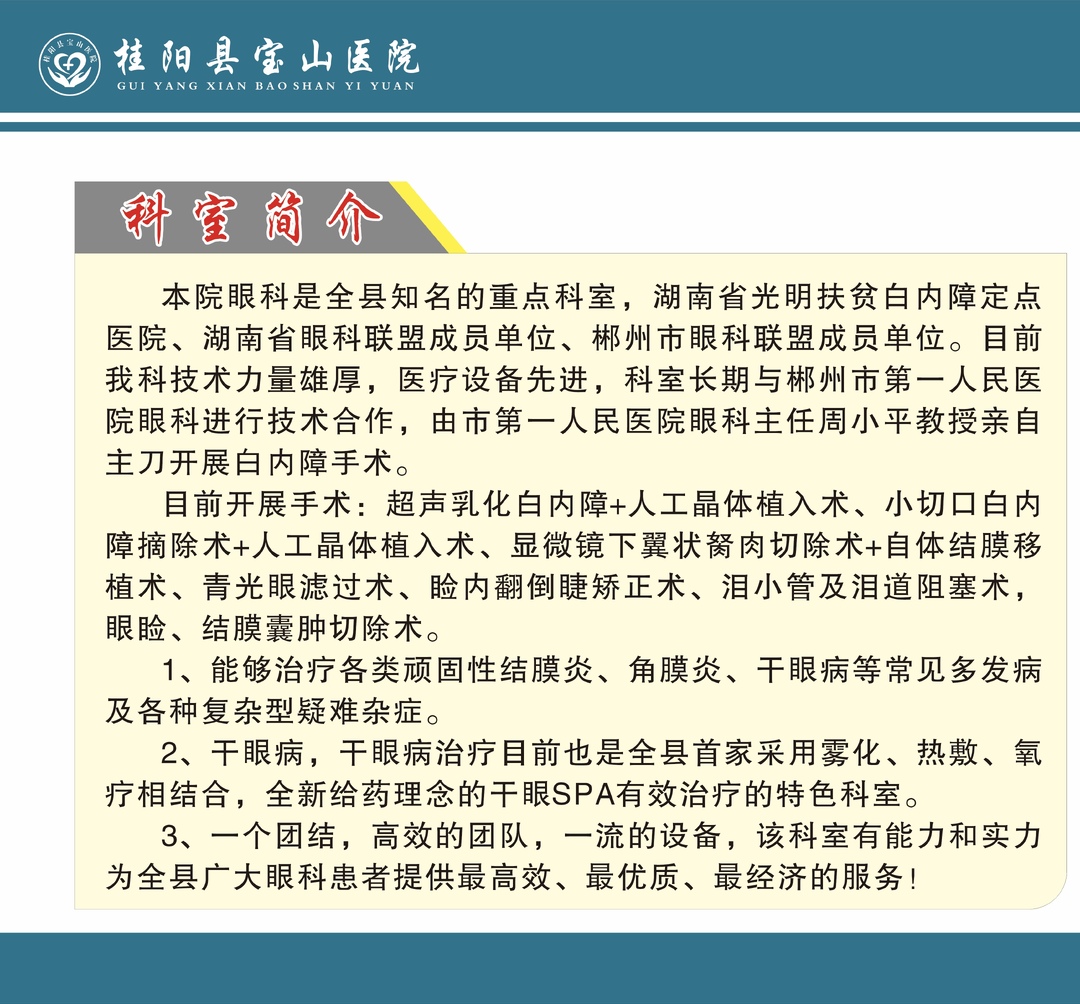 宝山医院眼科是湖南省光明扶贫白内障定点医院、湖南省眼科联盟成员单位、郴州市眼科联盟成员单位。眼科科室长期与郴州市第一人民医院眼科进行技术合作,由市第一人民医院眼科主任周小平教授亲自主刀开展白内障手术,能够熟练诊治白内障、青光眼、翼状胬肉、倒睫、泪囊炎、干眼症等常见多发病及各种复杂型疑难杂症。