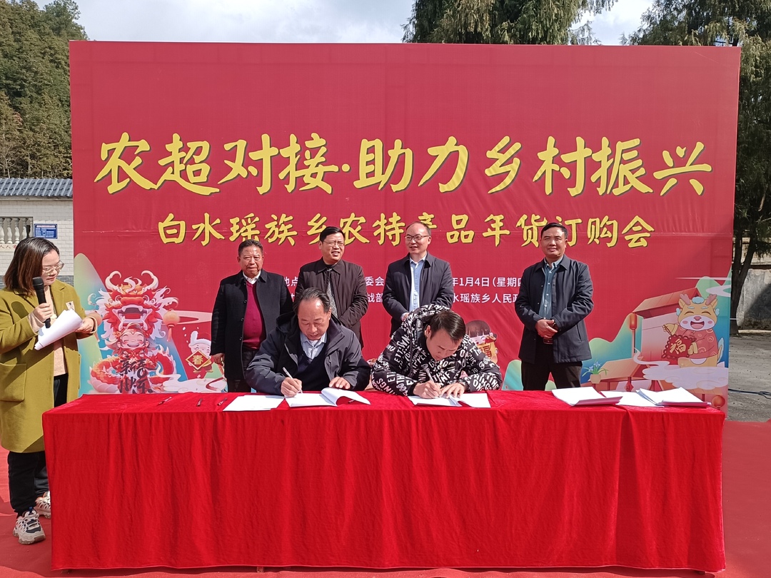 新桂阳1月5日讯(记者 李勇)为进一步推动我县农特产品进超市,增加农民收入,助力乡村振兴,1月4日,由县委统战部、县商务局、白水瑶族乡联合举办的“农超对接·助力乡村振兴”农特产品年货订购会在白水瑶族乡中白社区举行。