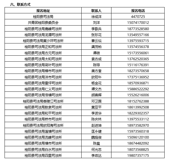 有兴趣者的大学生志愿者可采取现场报名(桂阳县司法局普法与依法治理股、团县委办公室和县司法局司法所均可报名)、电话报名(详见附件一)二种方式。