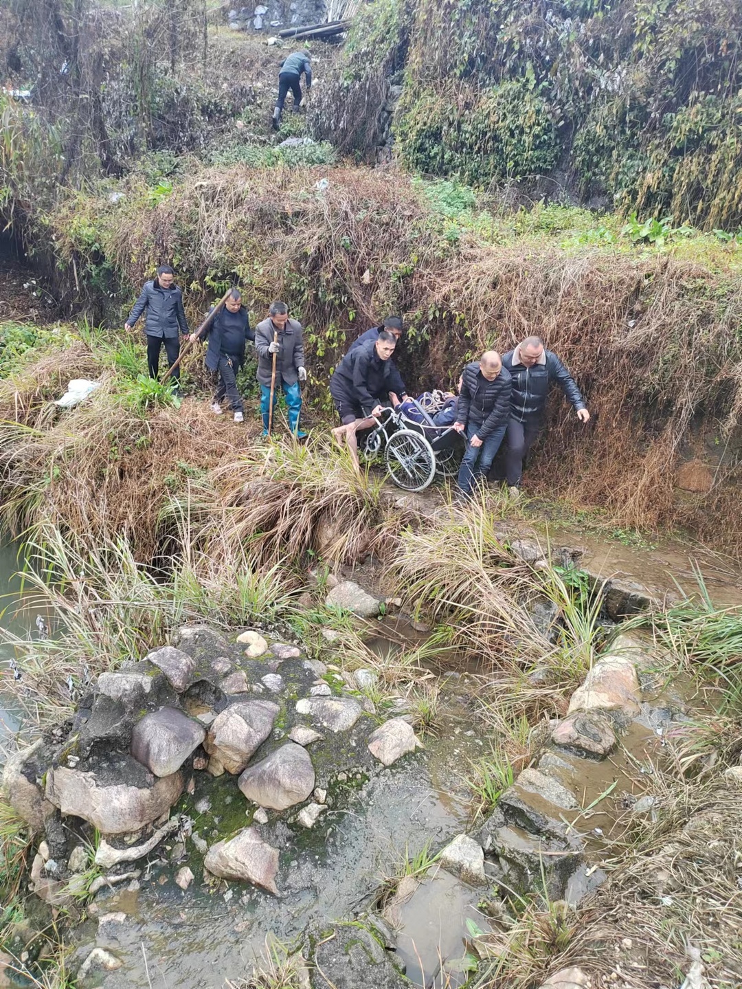 因地势低洼、边坡陡峭,何良长又是一名肢体残疾人。当时,干部群众拿着绳索、木棍、镰刀等工具,砍掉岸边杂草,合力开出一条路。随后,大家把何良长抬上轮椅,用绳索捆绑住轮椅后横拴木杠,最终把他成功救上岸。由于救援及时,何良长并无大碍。