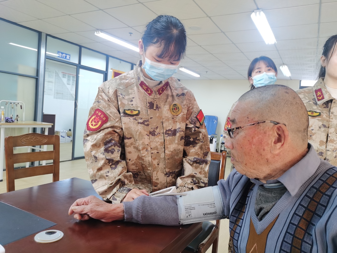 县人武部民兵医疗救护连的官兵们还为老人们进行了量血压、测血糖等体检,并提出健康指导建议。