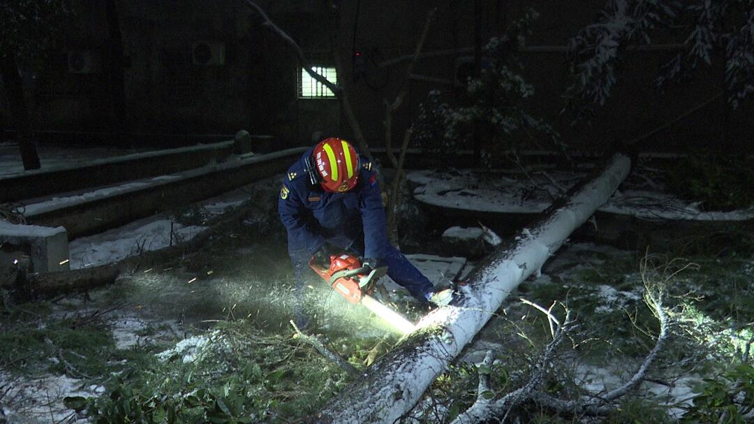 新桂阳1月23日讯(记者 周立志)1月22日,受冷空气影响,我县迎来2024年第一场雪。随着雨雪天气的持续,道路、树枝、房顶积雪越来越重,在我县鹿峰街道东塘医院内,一棵大树由于积雪太厚导致倒塌,阻碍群众出行。县消防救援大队接到电话求助后,立即组织人手前往现场,及时将大树进行修剪、截断,消除安全隐患,方便群众出行。