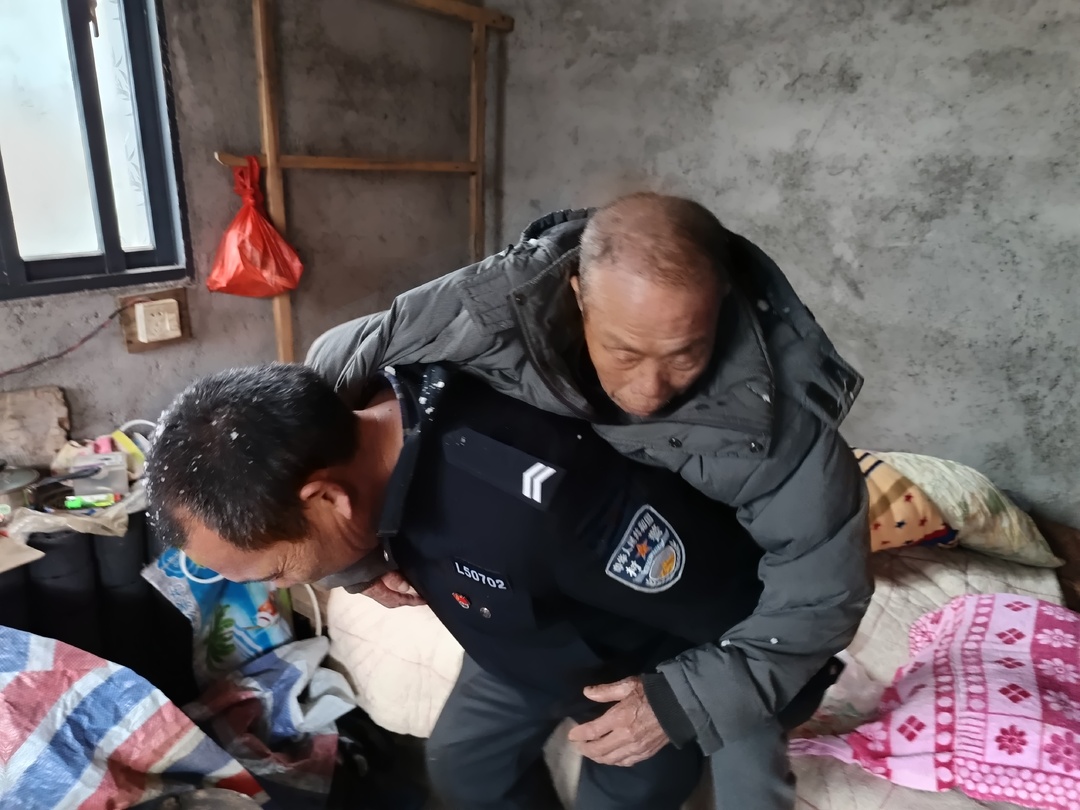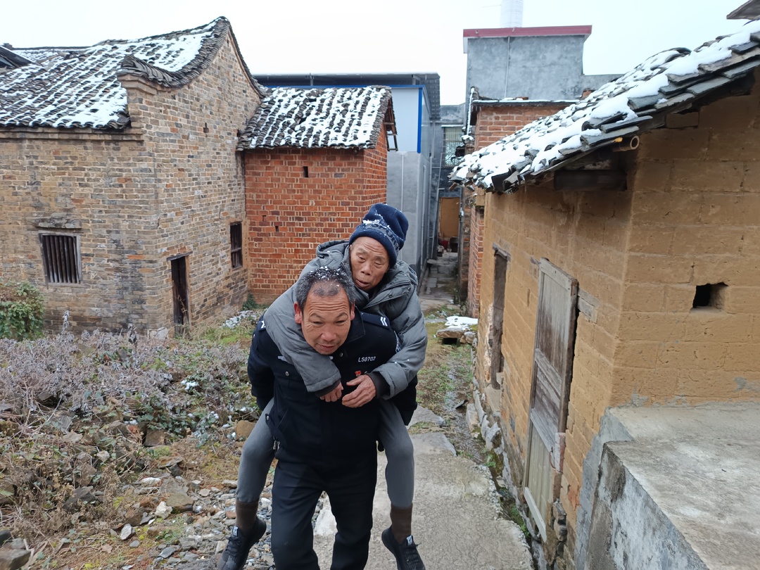新桂阳 1月25日讯(通讯员 尹荷英 欧阳海勇)1月23日早上,流峰镇下阳村的村警欧阳起亮在苦寻一天一夜后,终于在茫茫大雪中,从山顶的悬崖峭壁边上把已经失踪两天,并患有老年痴呆的80岁孤寡老人欧阳莲生成功寻回,并以一己之力,背着又冷又饿,早被冻得奄奄一息的老人,顺着三里多又湿又滑的羊肠小道,安全背回了家,让老人及时得到救治。而在这一天一夜的寻找中,欧阳起亮自己全身湿透,冻得身体快失去知觉。