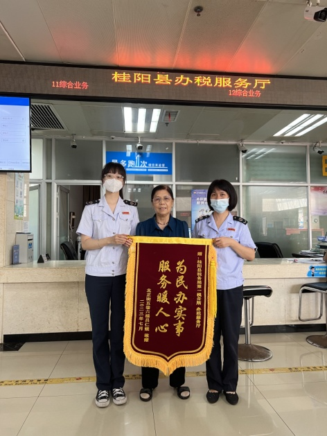 “要谢谢你们帮我办好了手续,我要送一面锦旗给你们!”84岁的吕仁娥奶奶为第一税务所送上了一面印有“为民办实事,服务暖人心”的锦旗。