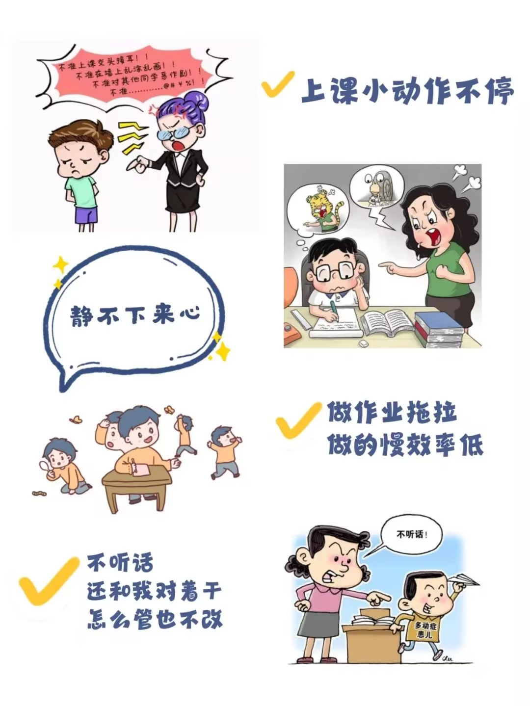 孩子在学校的表现如何?与同学关系好吗?学习成绩怎么样?上课时容易分心、爱搞小动作?亦或是喜欢发呆、“做白日梦”?写作业时粗心大意、拖拖拉拉……这些都是多动症、注意力不集中的表现。