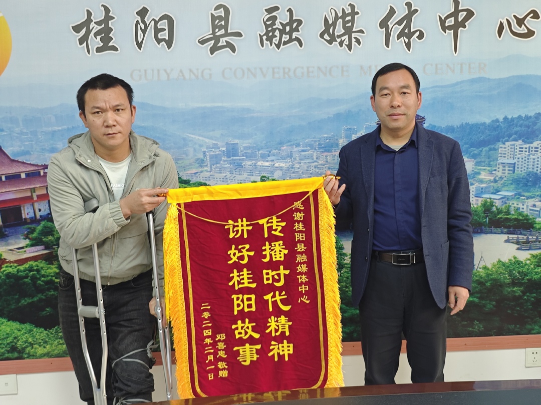 新桂阳2月1日讯(记者 廖诗卉 周立志 常凯 周琥)2月1日上午,桂阳县雷坪镇村民邓喜忠将印有“传播时代精神 讲好桂阳故事”几个醒目金色大字的锦旗送到桂阳县融媒体中心以表感谢。