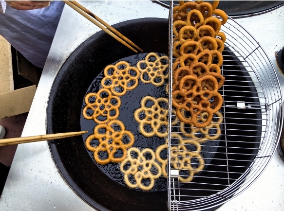 小块面团在“巧手”揉搓下,被搓成粗细均匀的长条,经验丰富的阿姨们手指灵活地将长条绕圈,捏成六个大圆环套着六个小圆环的花朵状。一环套一环,环环相扣,立春吃“套花”,有着六六大顺,阖家团圆的美好寓意。捏好的“套花”一个个下进油锅中,油炸几分钟后即可上捞摆盘食用。酥、脆、香、甜的“套花”是人们用糯米粉塑造出来的心意,吃在嘴里,甜进心里。“这就是我们的套花,六个大圈六个小圈。立春这一天吃‘套花’代表着我们一年十二个月,每个月都团团圆圆,幸福美满。”“套花”制作人谭朝铭展示着做好的“套花”说道。