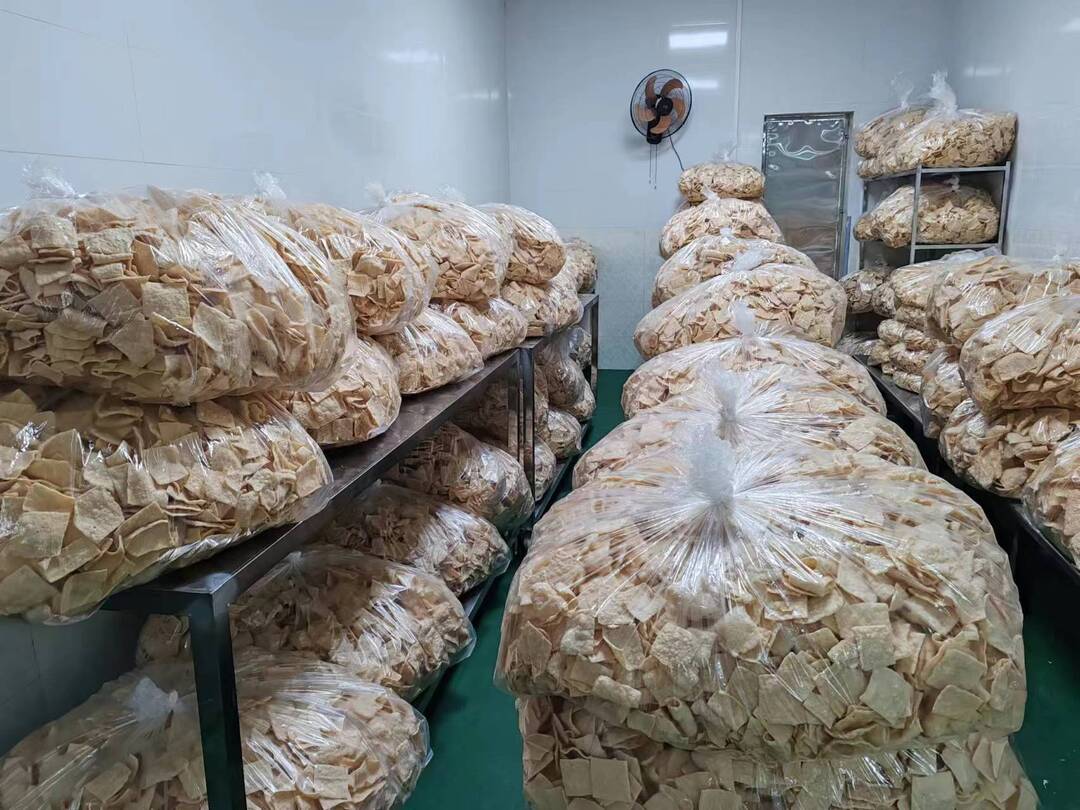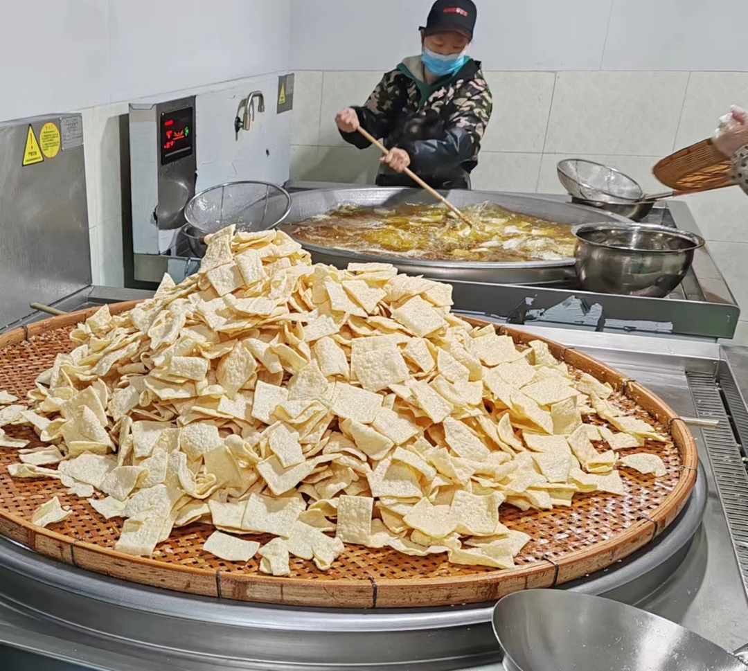 一颗颗精挑细选的黄豆被倒入磨浆机里慢慢碾磨,被碾碎的豆腐渣经过机器助力、手工挤压的双重工序,热气腾腾的豆汁一瓢又一瓢地被倒入桶中,豆香四溢。工人们两两协作,在模具上覆盖一层纱布,将凝固好的豆腐脑搅拌后浇在模具中,包上屉布,重复操作十几次。待豆腐箱中的水分被榨干,粘连着纱布的豆腐被挂在竹竿上自然晾干,再经过工人精细的刀工切成豆腐片,抖散后装入簸箕中,最后在固定温度下油炸,让豆腐在茶油里翻滚,使豆腐充分、均匀受热。十几分钟后,一片片金黄灿烂、薄如蝉翼的和平豆腐就新鲜出锅了,“咔嚓”一咬,酥脆爽口。