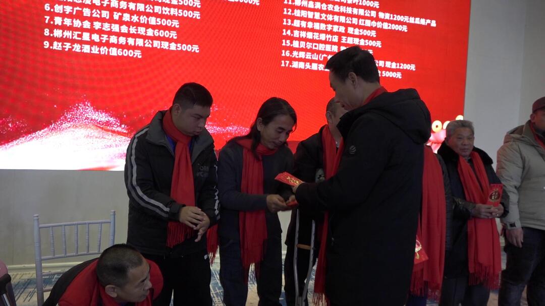 来自全县各乡镇(街道)的60余名残疾人士欢聚一堂,通过歌曲联唱、茶艺表演等方式喜迎春节的到来。爱心企业还组织现场募捐,为残疾人士发放慰问金,并送上大米、面条、春联等爱心物资。