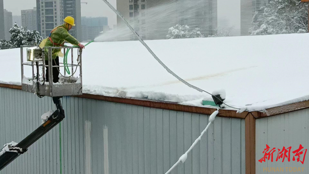 (工作人员正在清除顶棚积雪。通讯员供图。)