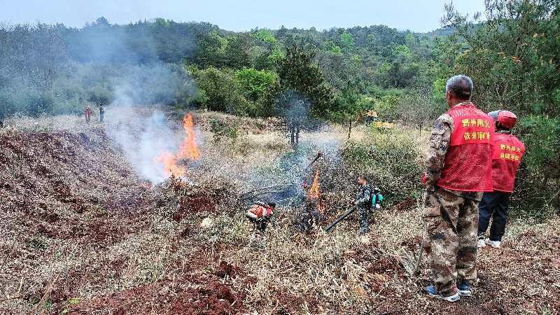 “山头着火了,着火了!”应急演练队伍接到森林火情后,迅速启动森林防火应急预案。随着总指挥长的一声令下,队员们迅速集合,锁定火源后,使用专业灭火机、打火把对起火点进行扑救,用相应工具扑灭残留火星,并对火场进行挖土覆盖,火情很快得到了有效控制。