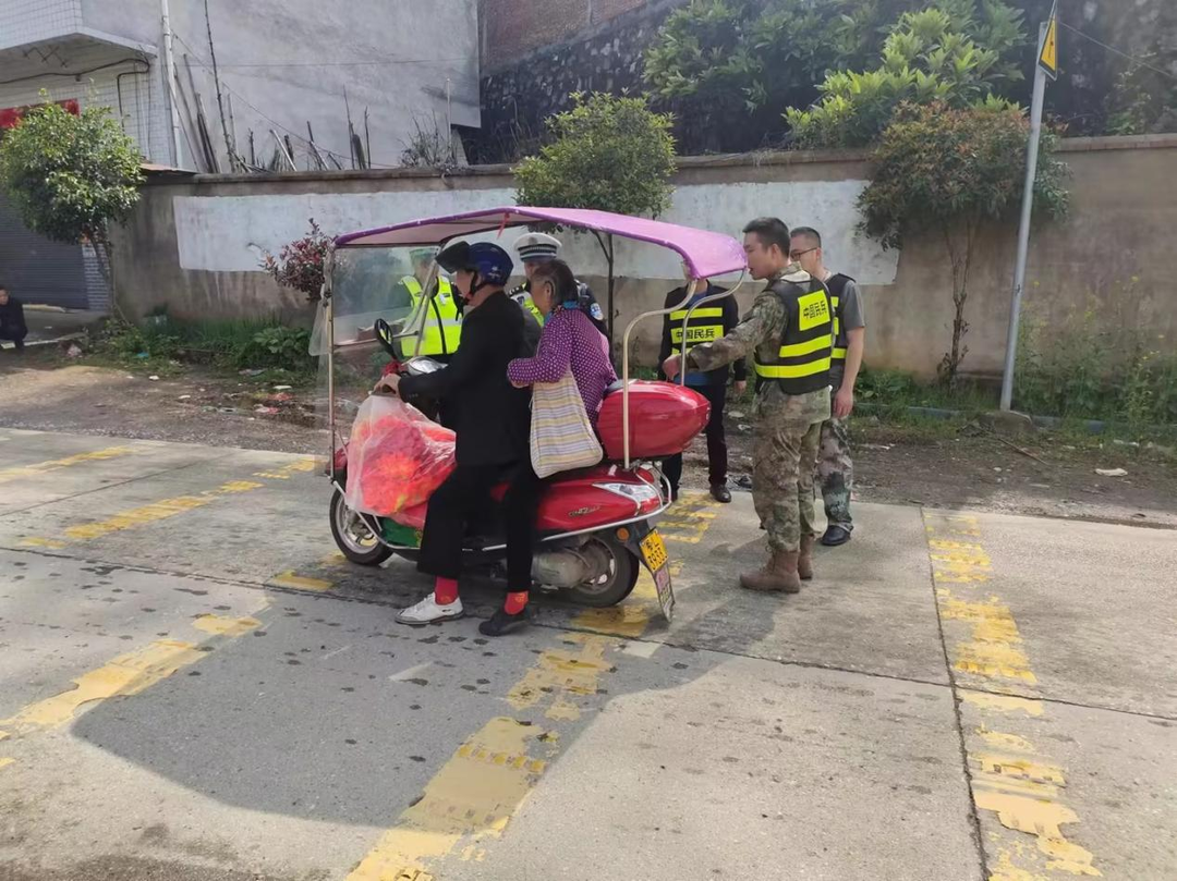 在塘市镇圩场周边路口,基干民兵身着迷彩服,重点整治路面违法行为,疏导交通,对过往的电瓶车、摩托车等重点车辆进行检查。同时,对农村驾驶员和群众安全法规意识淡薄、无证驾驶、超员超载、驾驶摩托车违规载人、不戴头盔等行为进行劝导,告诫驾驶员要遵守交通安全法律法规,自觉抵制交通违法行为,认真遵守交通秩序。