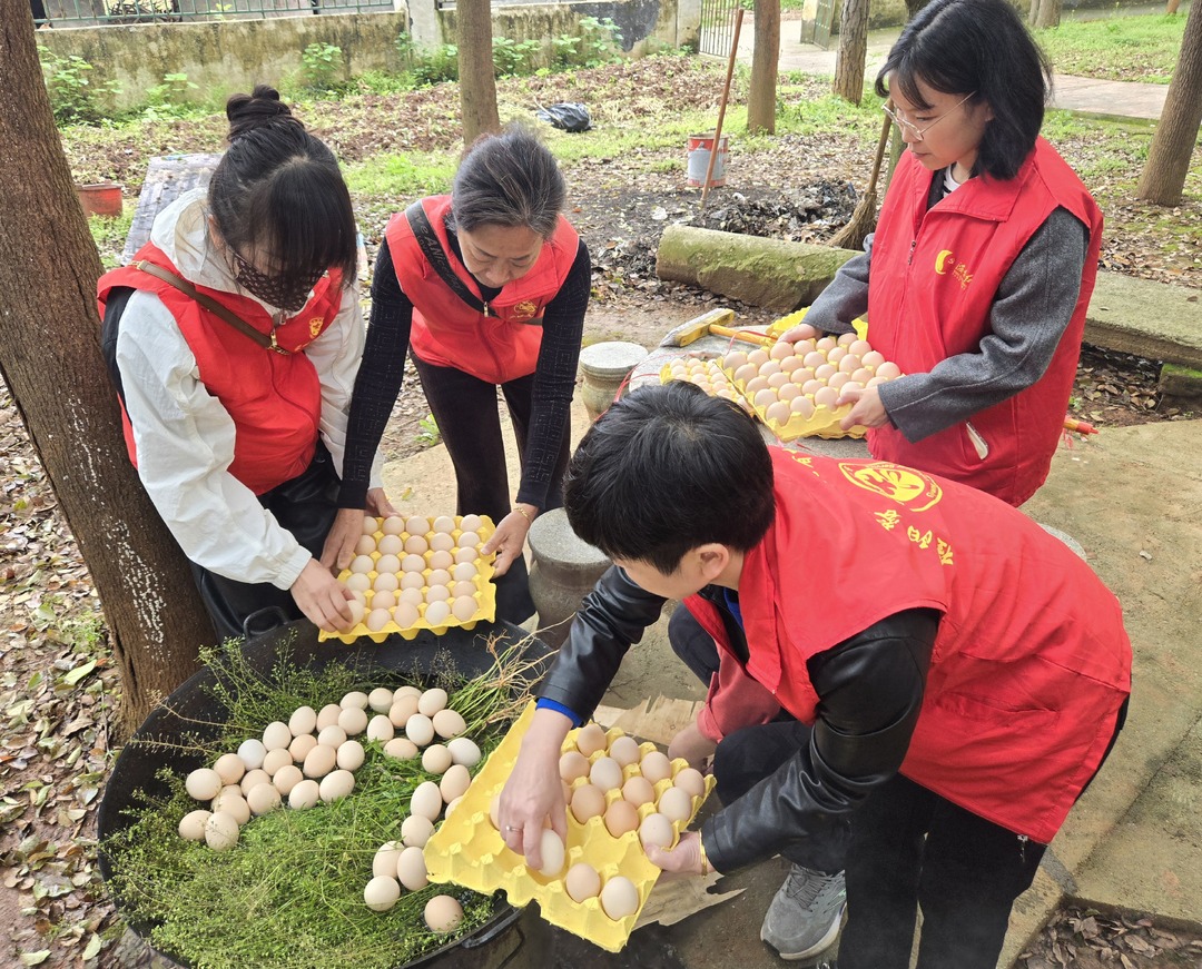 在樟市镇,县蓉城志愿者协会志愿者与老人们一起在田间地头寻找荠菜,采摘的新鲜荠菜根茎韧枝叶小。冷水入锅后,再铺上新鲜鸡蛋,添火煮至沸腾,一道春日食补荠菜煮鸡蛋便完成了。