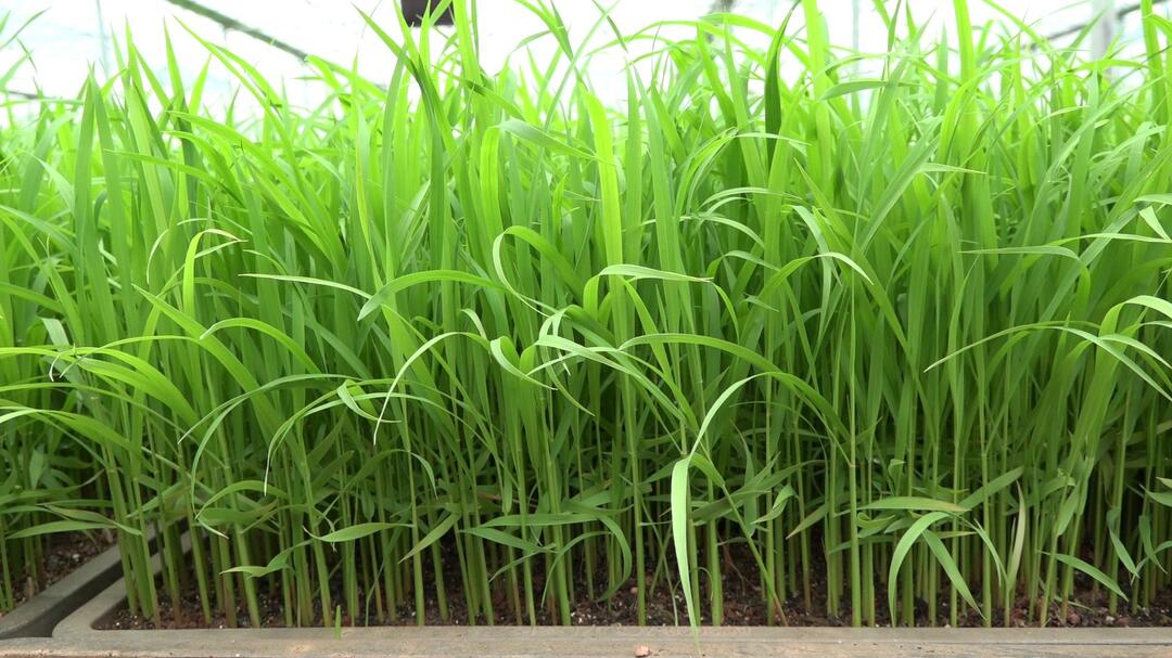 在敖泉镇蒹葭村的育秧棚里,经过20多天的培育,翠生生的秧苗整齐地摆放着。工人们从移栽盘将秧苗卷起,叠放在箱子内,准备将它们移栽到水田里。