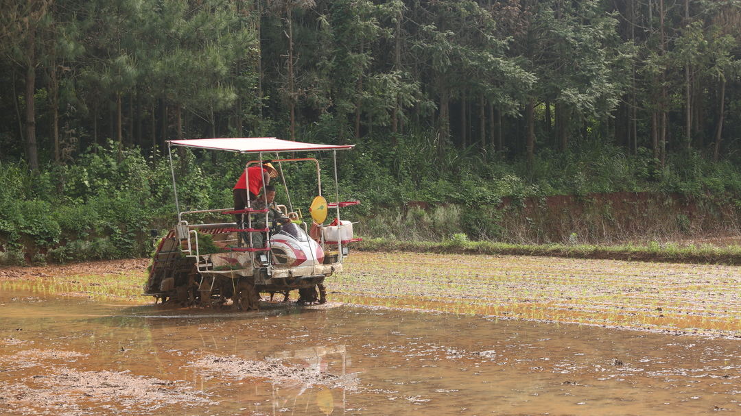 在仁义镇平岗村流转田地里,水田耕地平整开阔,土壤肥沃,农田里春潮涌动。县人武部组织民兵和农技人员操作插秧机,将一排排青嫩秧苗整齐种在水田里。近年来,为落实粮食安全生产工作,平岗村通过土地流转方式,将300余亩荒地翻耕进行早稻种植,盘活土地资源,为支部农场带来了经济效益。