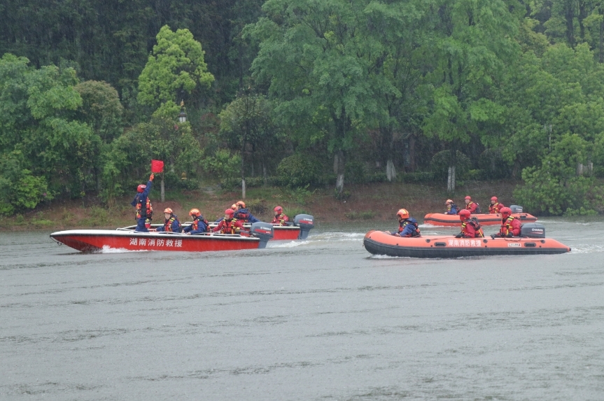 在桂阳文化园水域,演练模拟某水库遭受强降雨而引发超标准洪水,群众被洪水围困,消防员利用冲锋舟和橡皮艇等专业救援设备,开展水域搜索、活饵救援、O型救援等实战演练。