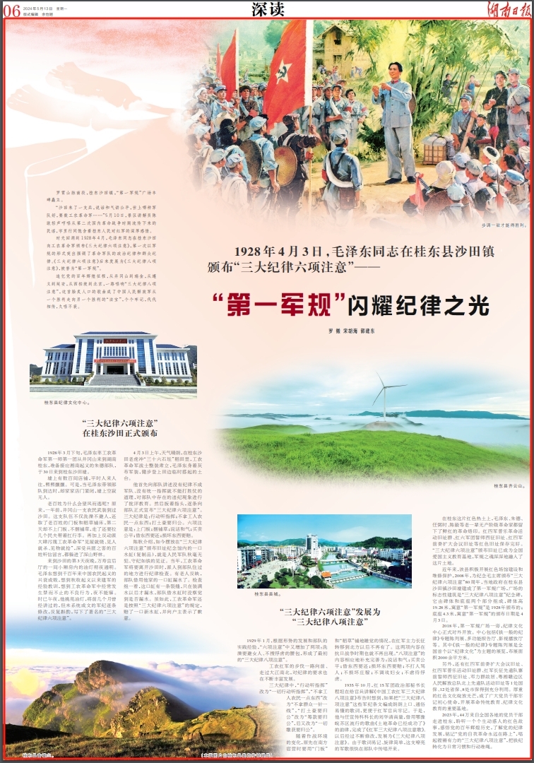 1928年4月3日,毛泽东同志在桂东县沙田镇颁布“三大纪律六项注意”——