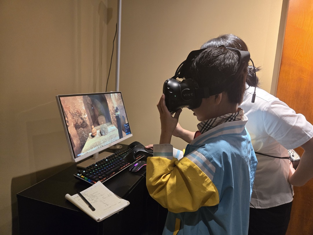 在刘家岭壁画墓陈列馆,五十余名学生在讲解员的引导下有序入馆参观。展示厅建立在一座宋代古墓遗址上,大家从高处俯瞰砖砌墓体结构轮廓,直观感受文物的魅力,戴上VR眼镜,观看3D动画重构刘家岭壁画的完整内容,了解两千多年前桂阳土地上文化、历史、生活场景,奔赴了一场千年文化之约。