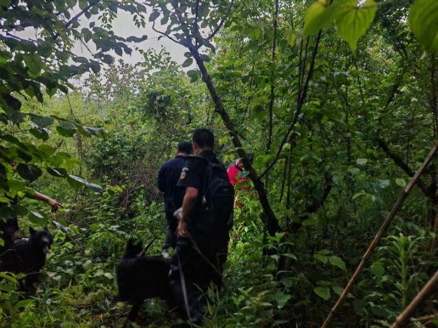 警犬训导员携警犬通过提取老人的枕巾作为嗅源,携犬开展追踪,在燕塘村深山一处竹林,警犬突然停了下来,朝着前方的地上嗅了嗅,并发出警示的叫声,找到了老人出门时携带的雨伞。