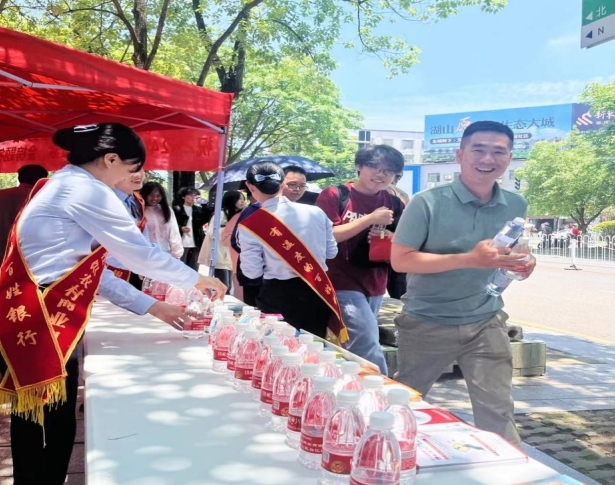在桂阳一中考点外,桂阳农商银行爱心助考志愿服务台格外醒目,服务台上整齐摆放着矿泉水、纸巾、文具、雨伞、藿香正气水、风油精、小零食等便民和消暑物品。该行志愿者们正忙碌着给路过的考生及家长赠送矿泉水等物品,提醒考生和家长考试期间应注意的事项,鼓励考生放松心态、积极应考,送上属于农商银行的贴心关怀和美好祝福。