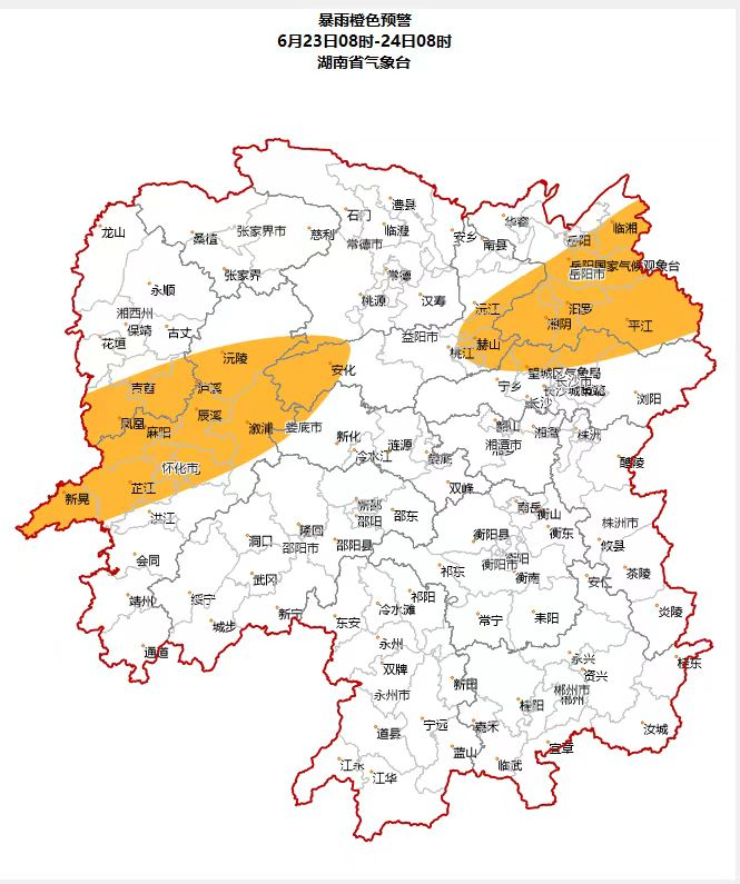 湖南省气象台6月23日6时发布暴雨橙色预警:预计23日8时至24日8时,长沙西北部、岳阳、益阳南部、怀化北部、湘西州南部部分地区将出现暴雨,局地大暴雨,并伴有短时强降水、雷雨大风等强对流天气,请加强防范。