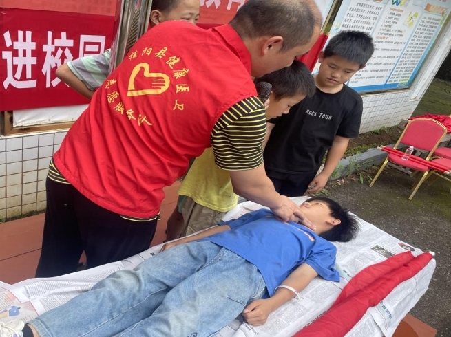 “急救时,我们首先要让病人采取仰卧位姿势,将手轻轻放在颈动脉的位置,评估搏动状态。”在完成紧急救护措施理论知识讲解后,工作人员邀请部分学生上台互动,指导他们实操练习。学生们全神贯注,积极提问,一步步根据工作人员的指导开展急救。