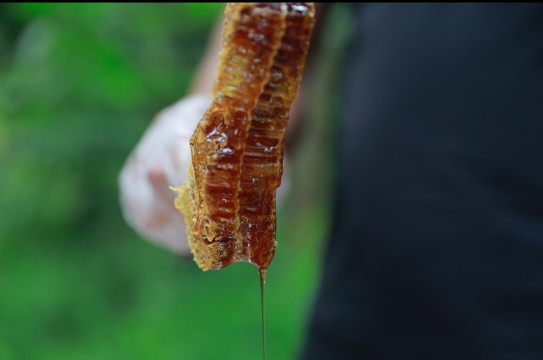 荷叶镇新湘家庭农场农场主谭湘平介绍道:“在我们这个高海拔山区,这个植被茂盛,蜜源丰富,非常适合我们放养这个中华小蜜蜂,因为它比较容易管理,我们只要选好适当的位置,把它分布好去放养,这个我们每一年就可以取到一两次的成熟蜜。