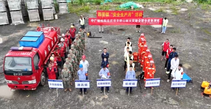 演练突出实战实用,结合中广核湖南桂阳风力发电有限公司地理位置和存在危险源情况,模拟光伏发电板子阵外侧突发火灾,火势呈放大趋势,现场燃烧产生大量浓烟,有人员受伤。